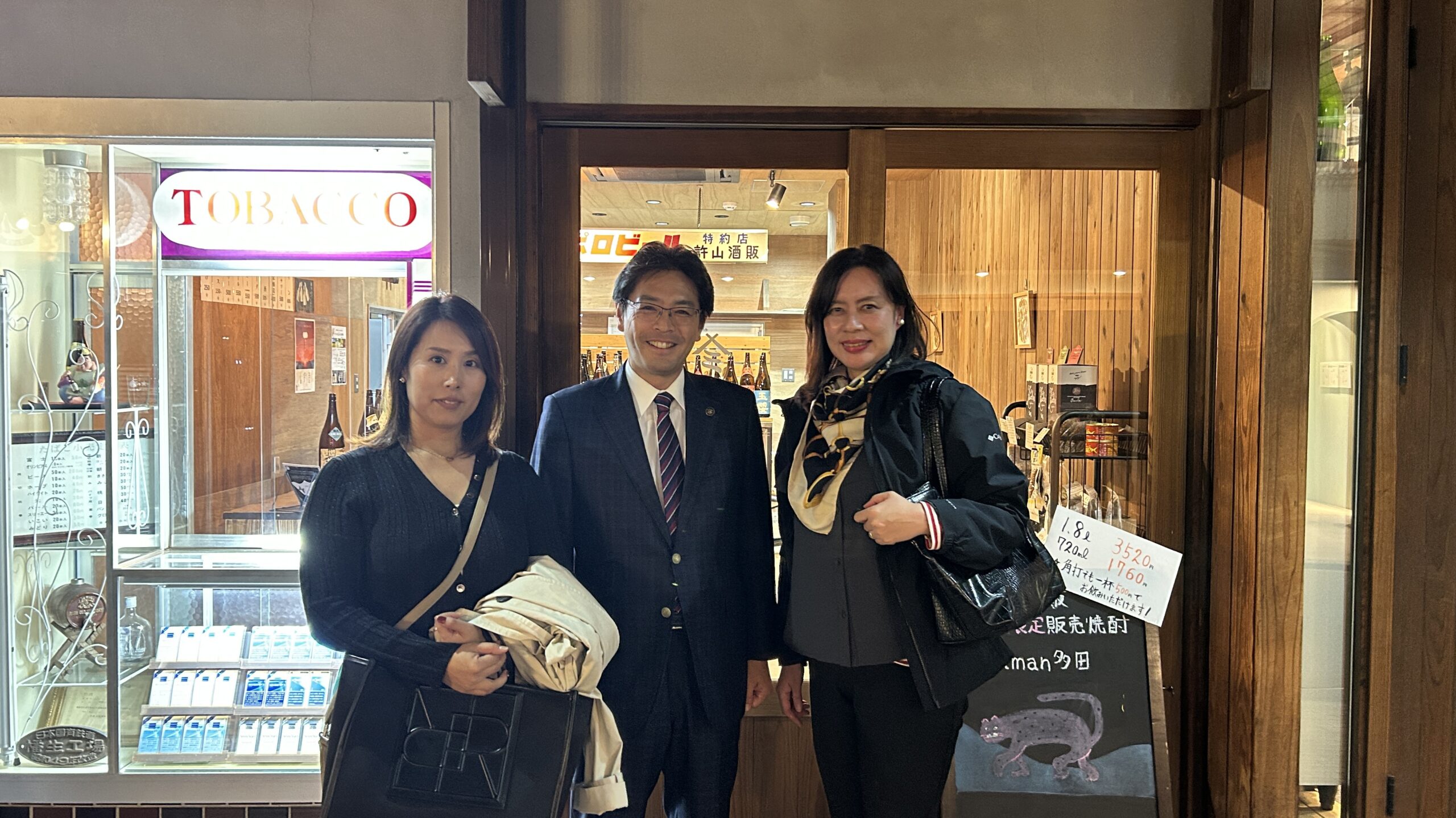 古賀市での交流のハイライトは、地元の伝統文化である「角打ち体験」です。酒屋さんで買ったお酒をその場で立ち飲みする文化は、肩書きや立場を超え、偶然隣り合った人同士が気軽に語り合える“フラットさ”が魅力。