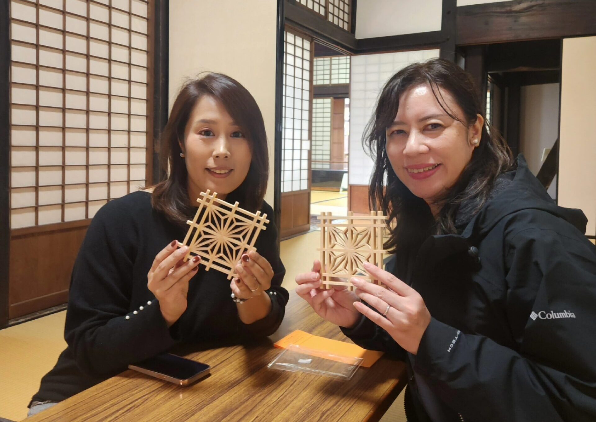 ■ 古民家で大川組子体験と、夜の昇開橋意見交換後は、旧吉原家住宅(国指定重要文化財)にて、大川組子細工のワークショップへ。 釘を使わず木を組み合わせ模様を生む、日本の繊細な木工技術に心から感動しました。