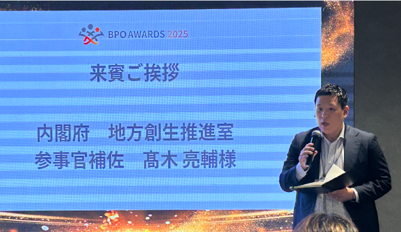 来賓として登壇された内閣官房 新しい地方経済・生活環境創生本部事務局地方創生推進室 参事官補佐の髙木亮輔氏は、受賞企業・関係者への祝意とともに、「地方こそ成長の主役」であると語られました。政府が掲げる「地方創生2.0」の取り組みに触れながら、東京一極集中を是正し、テレワークによって全国どこでも働ける環境を整えることの重要性を強調。内閣府としてもBPO事業者の取り組みを積極的に後押ししていく姿勢を明らかにされました。「今回の受賞事例が、全国の企業や自治体にとって新たなモデルとなり、地域の特性に応じた取り組みが広がっていくことを期待している」と結ばれました。